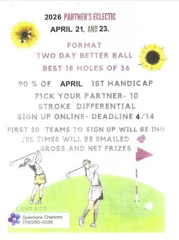 A fun partner's better ball stroke play event played over two days. You pick your own partner, however a 10-stroke differential will apply. Day One you record your team's better ball score for each hole. On Day Two, you try to improve upon that Day One score. This event is flighted, and there are prizes for gross and net.